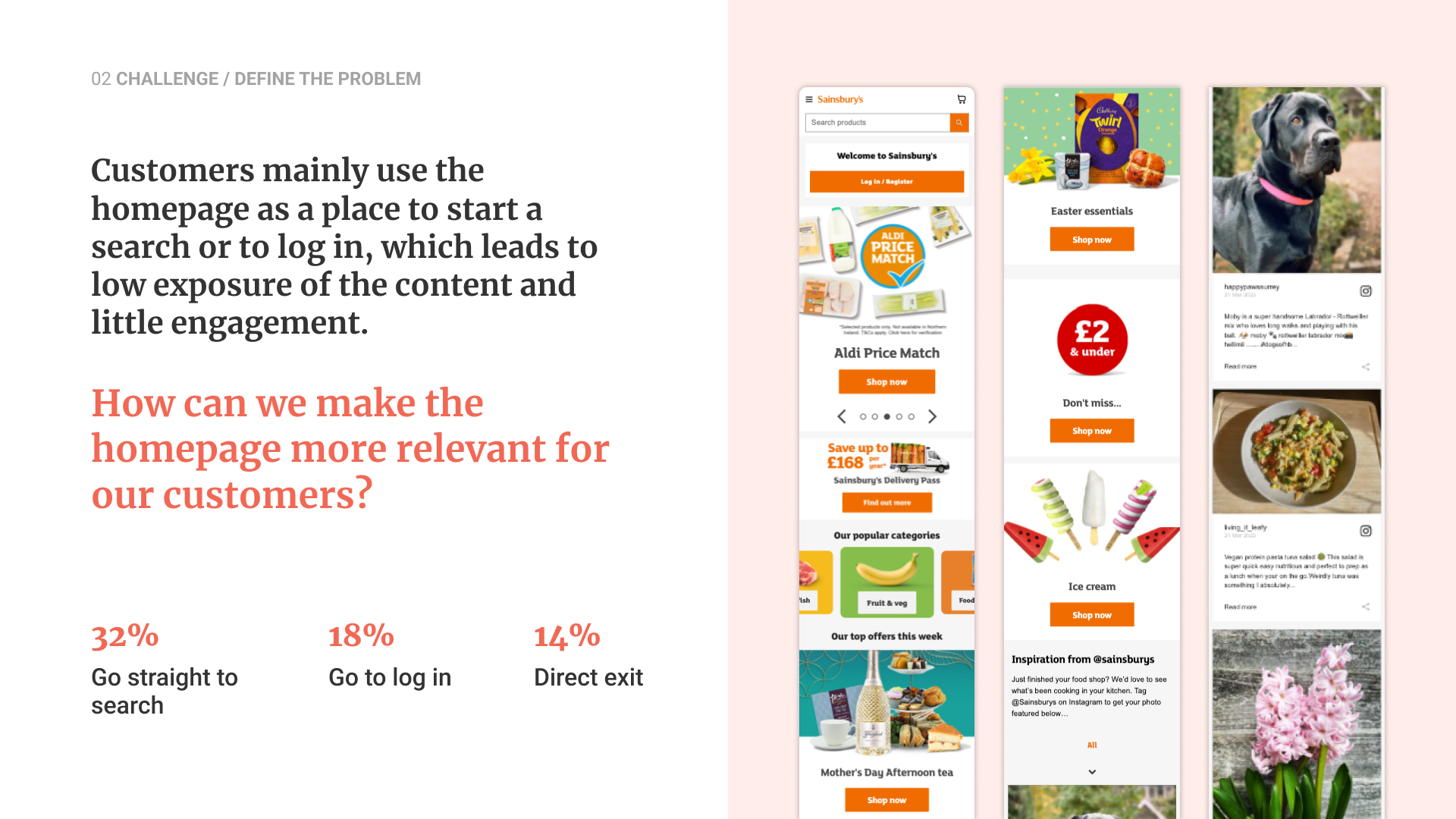 I focused on ease at the top-of-page, bucketing up value-led content in the middle, and personalisation of the customer experience such as favourites, forgotten favourites, coupons, Nectar points, Top-up basket component, previously viewed products, etc. These early concepts helped us visualise how a mission-aware experience could better support different shopping behaviours.