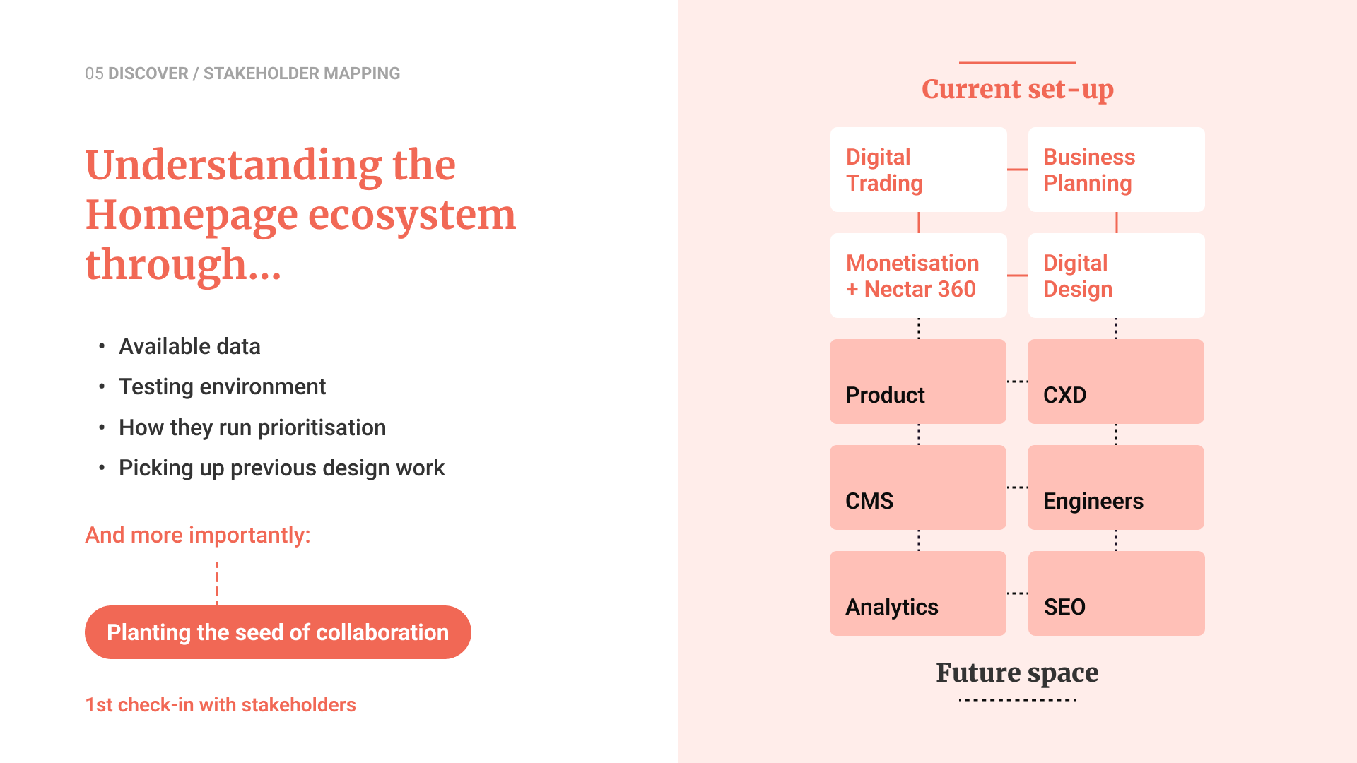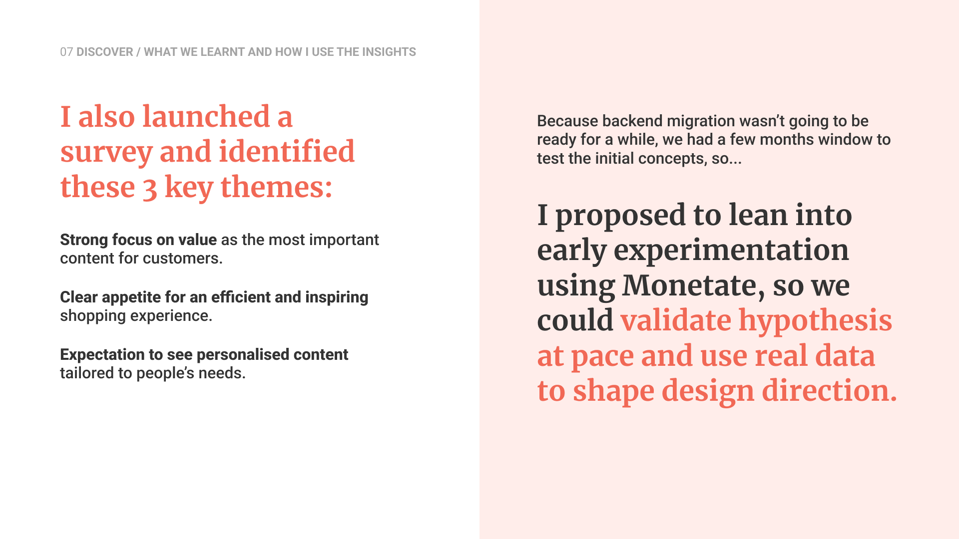 Stakeholder mapping and a survey highlighted the need for value, efficiency and personalisation. With migration still months away, I initiated early experiments using the testing platform Monetate to validate hypotheses and guide the design direction.