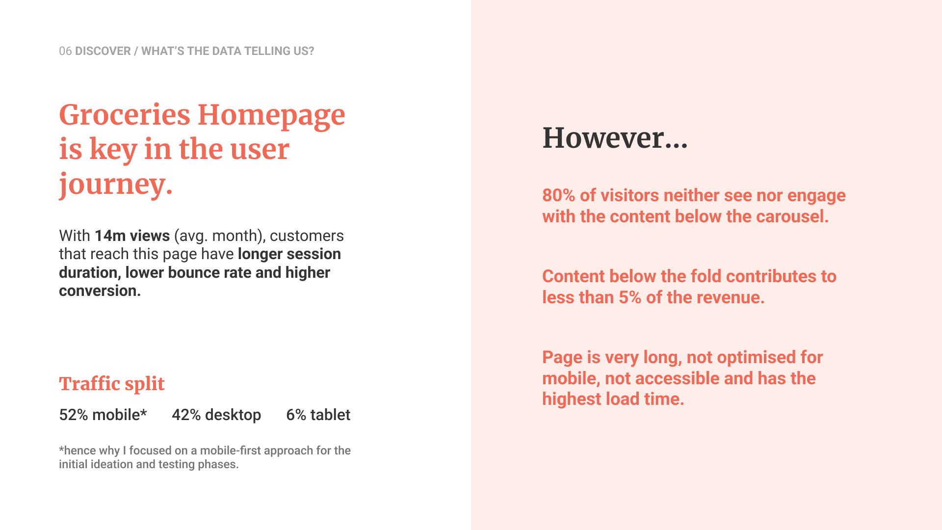 To guide the design direction, we established three principles: efficiency first at the top of the page, a strong emphasis on value, and personalisation across the journey, partnering closely with value and merchandising leads to ensure alignment.