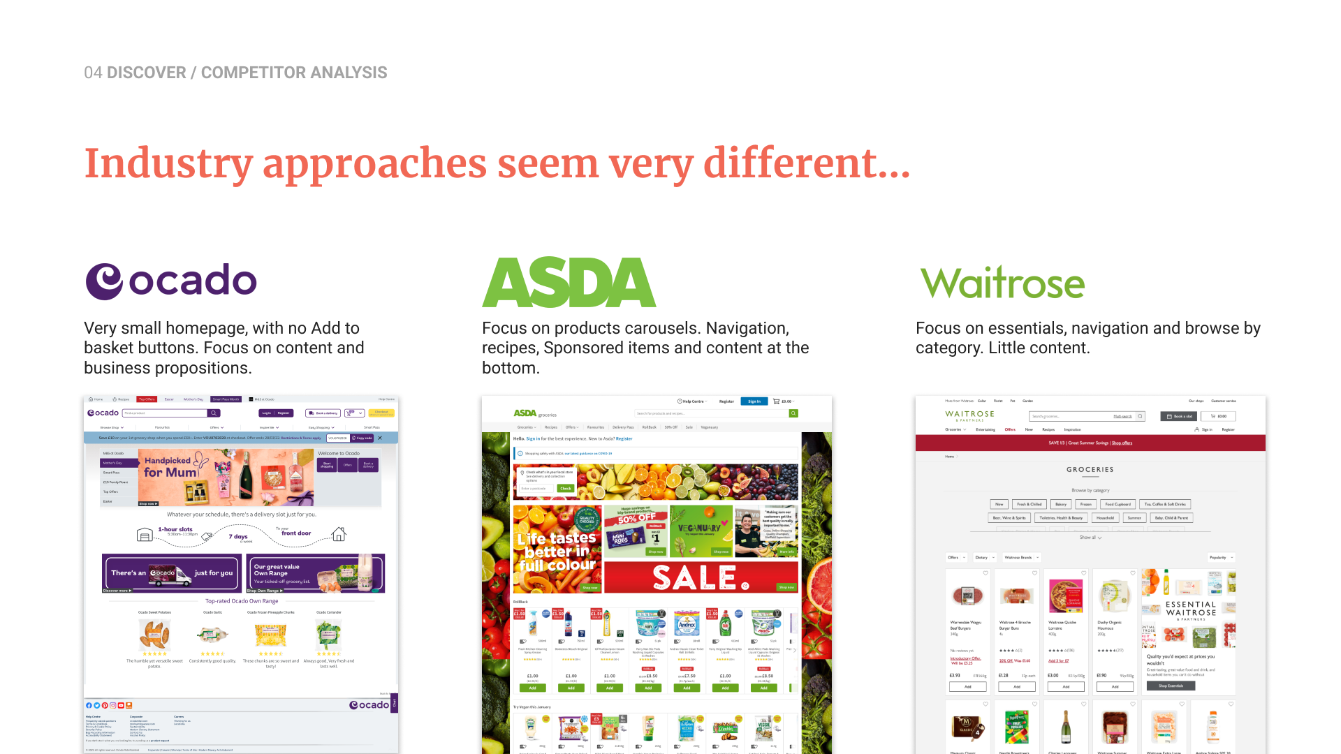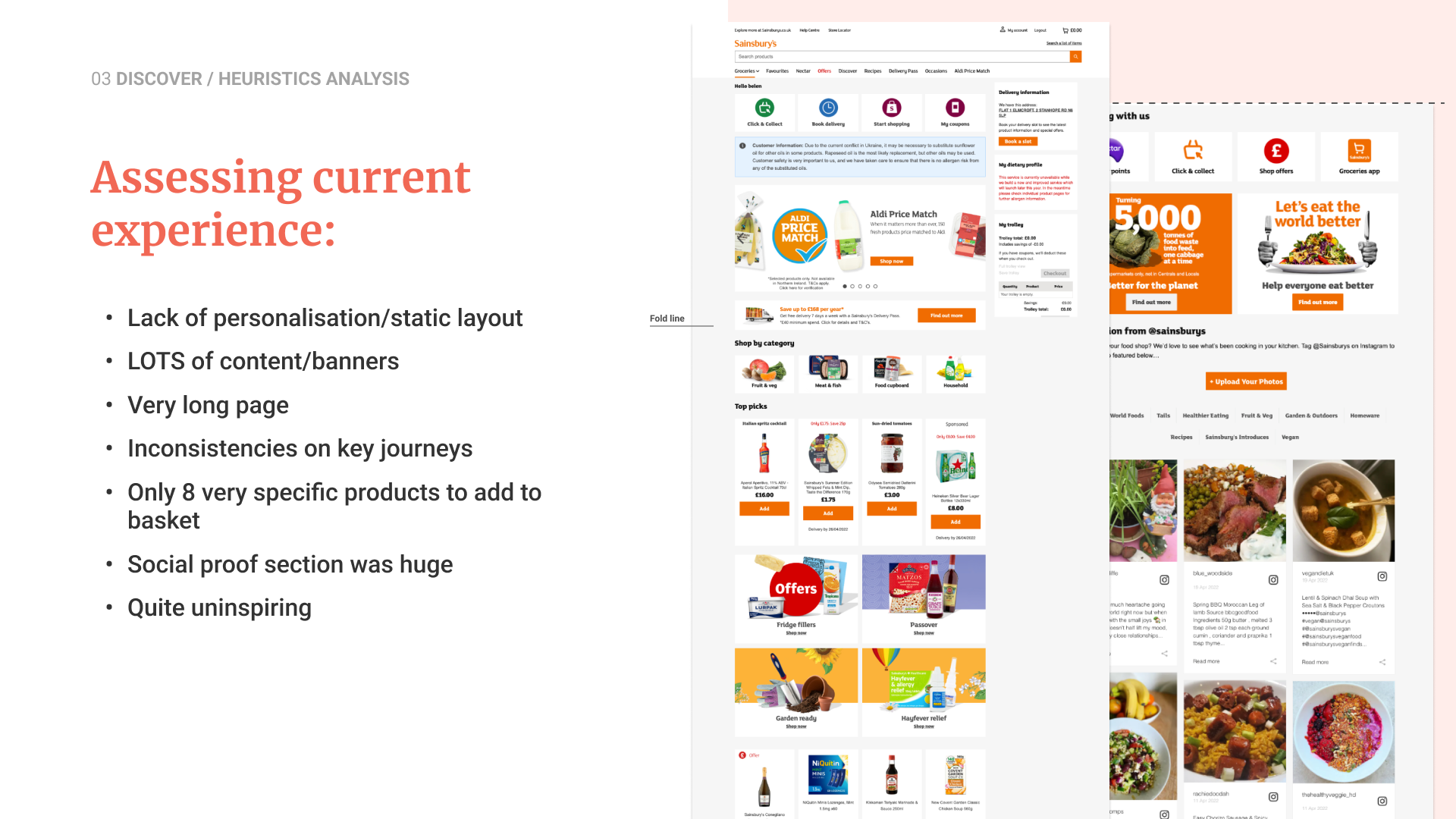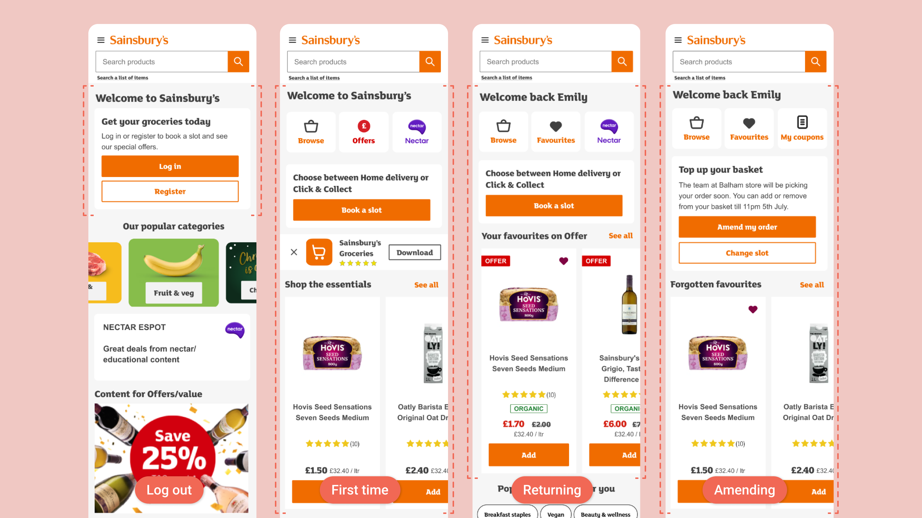 I focused on ease at the top-of-page, bucketing up value-led content in the middle, and personalisation of the customer experience such as favourites, forgotten favourites, coupons, Nectar points, Top-up basket component, previously viewed products, etc. These early concepts helped us visualise how a mission-aware experience could better support different shopping behaviours.
