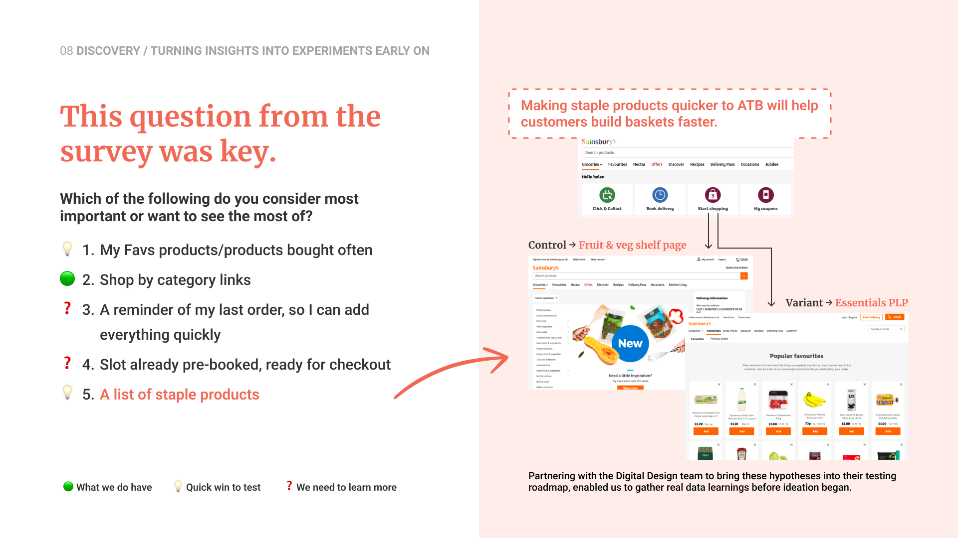 Stakeholder mapping and a survey highlighted the need for value, efficiency and personalisation. With migration still months away, I initiated early experiments using the testing platform Monetate to validate hypotheses and guide the design direction.