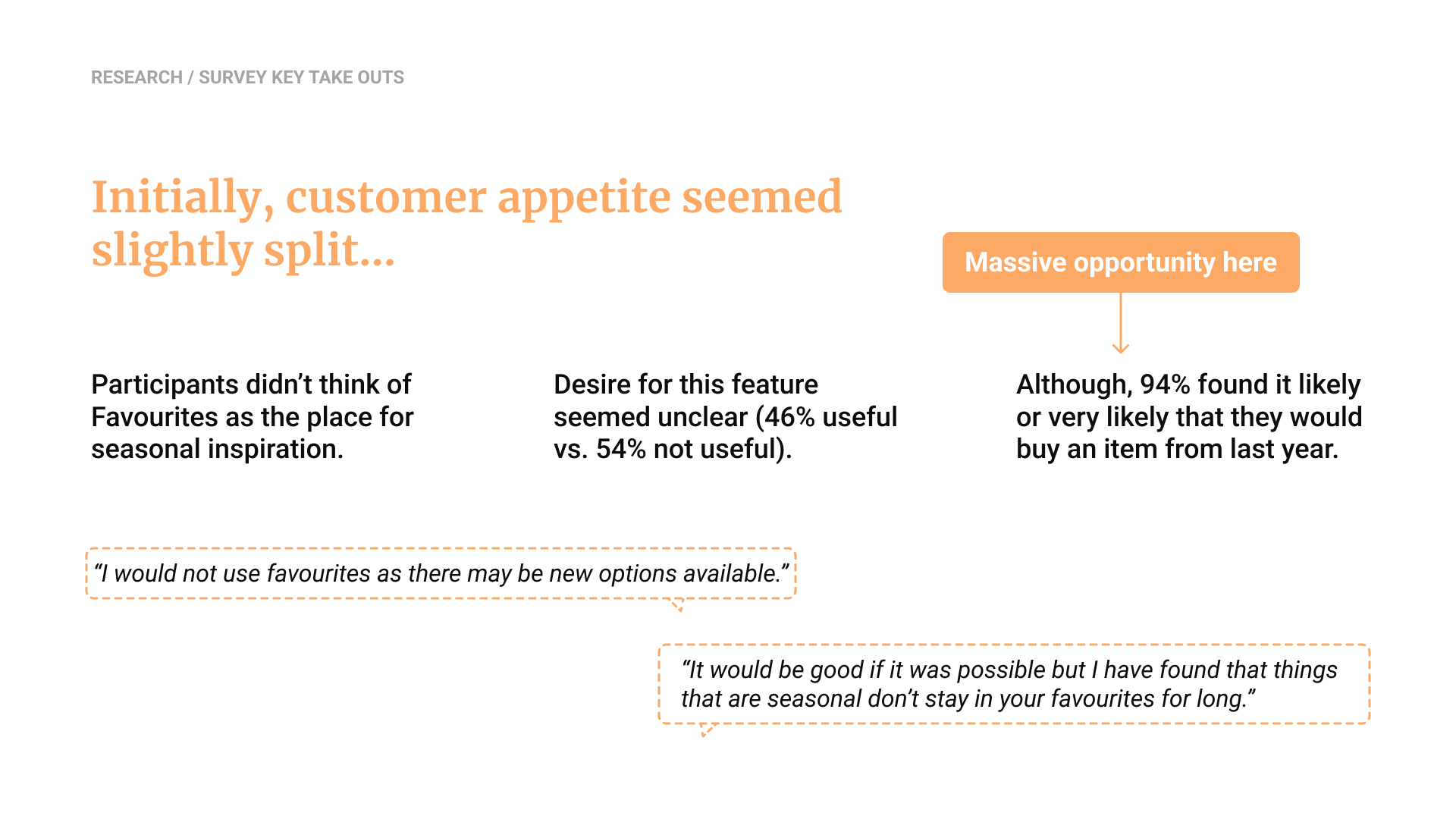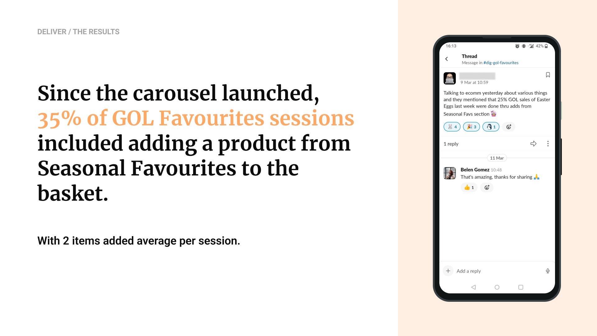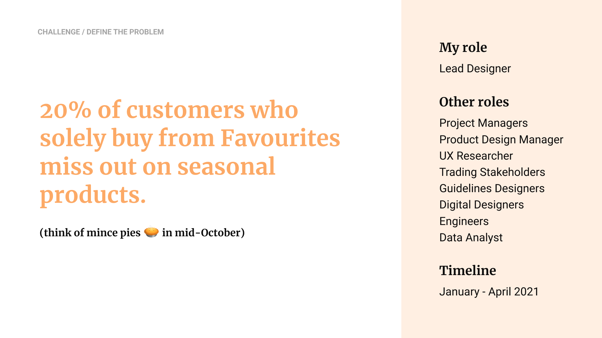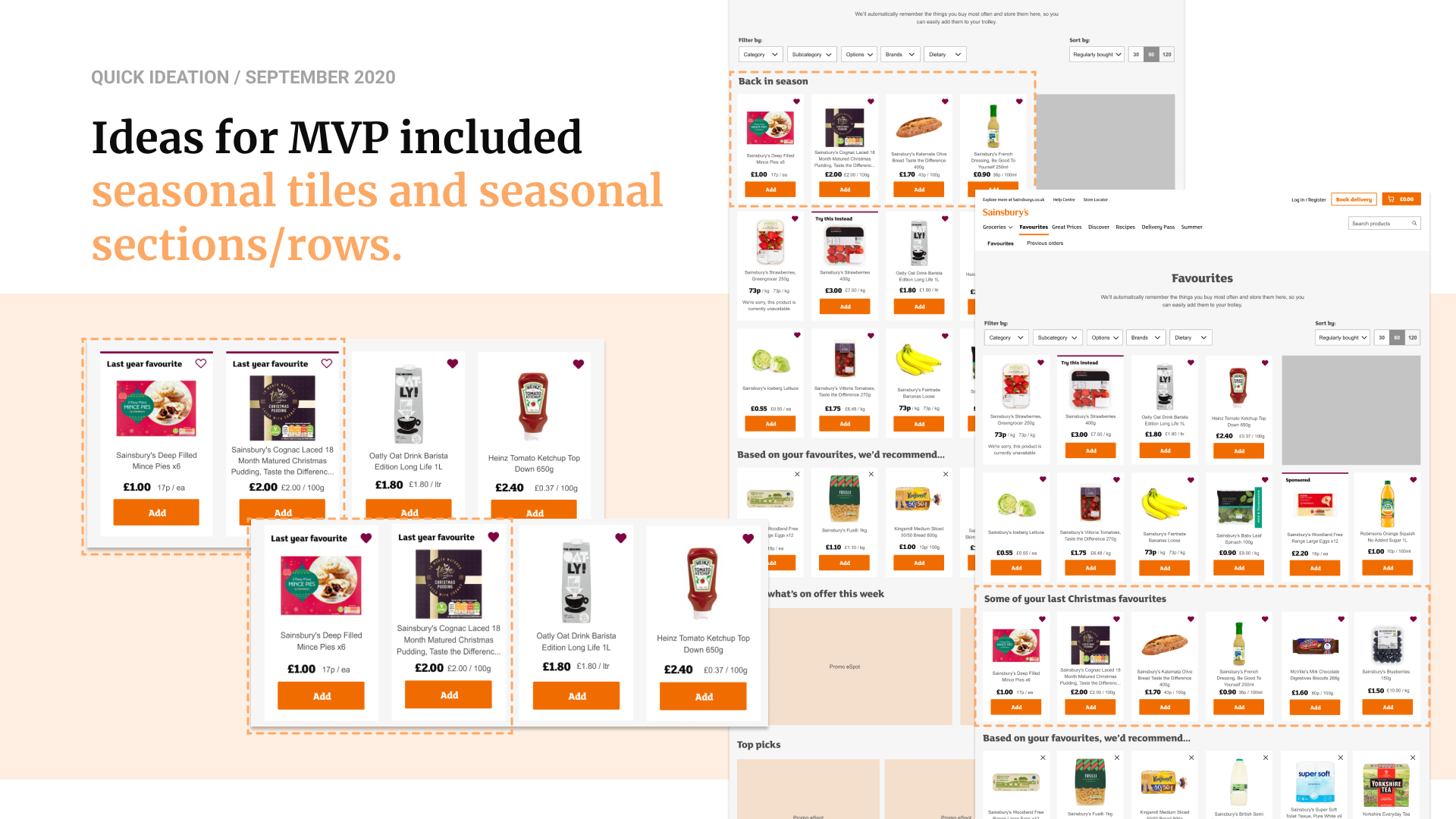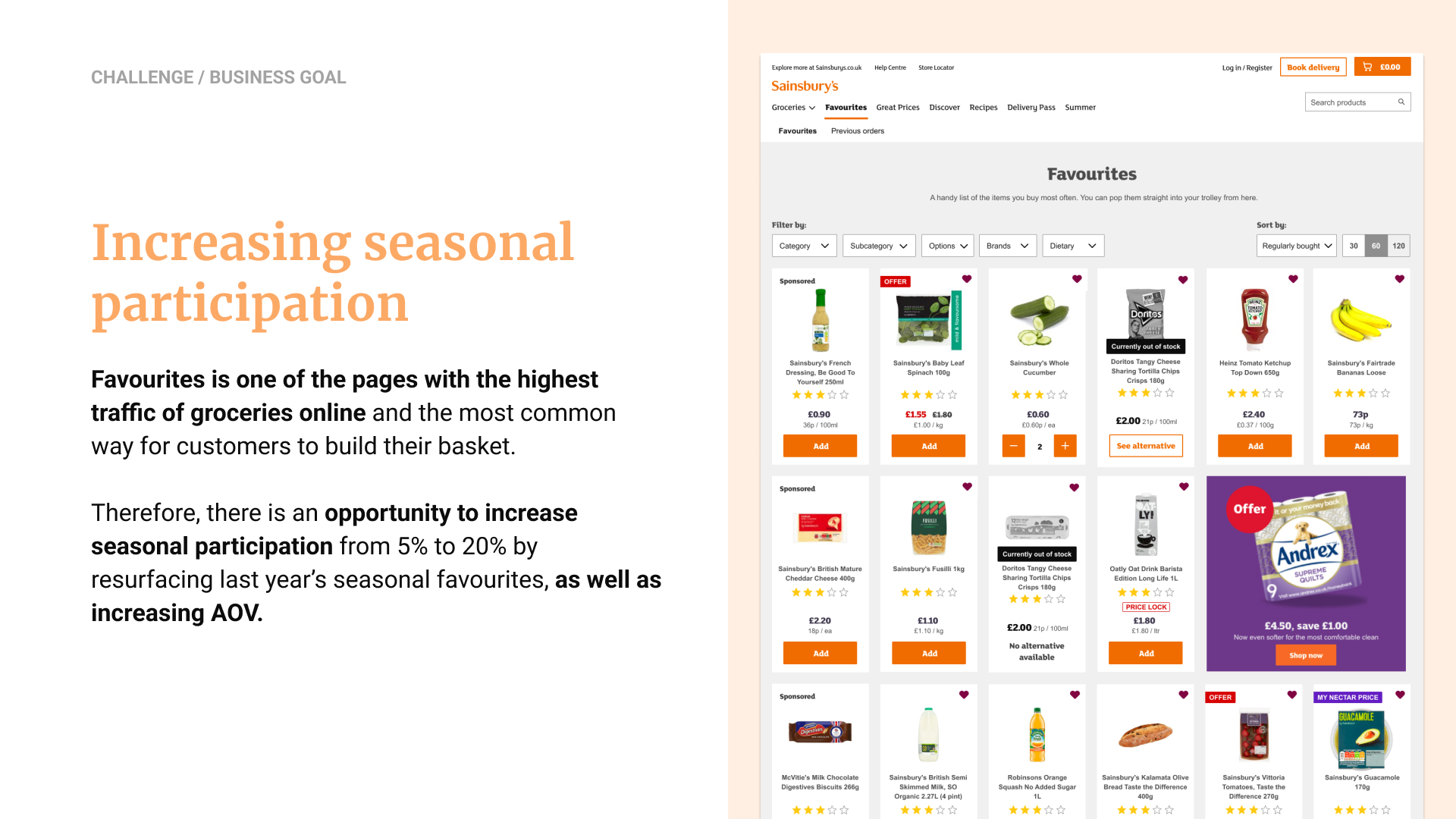 I designed and launched the Seasonal Favourites carousel, used in 35% of customer sessions in its first quarter and increasing seasonal participation from 5% to 25%.