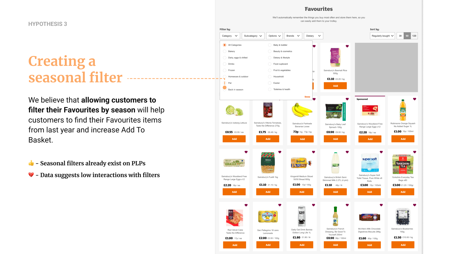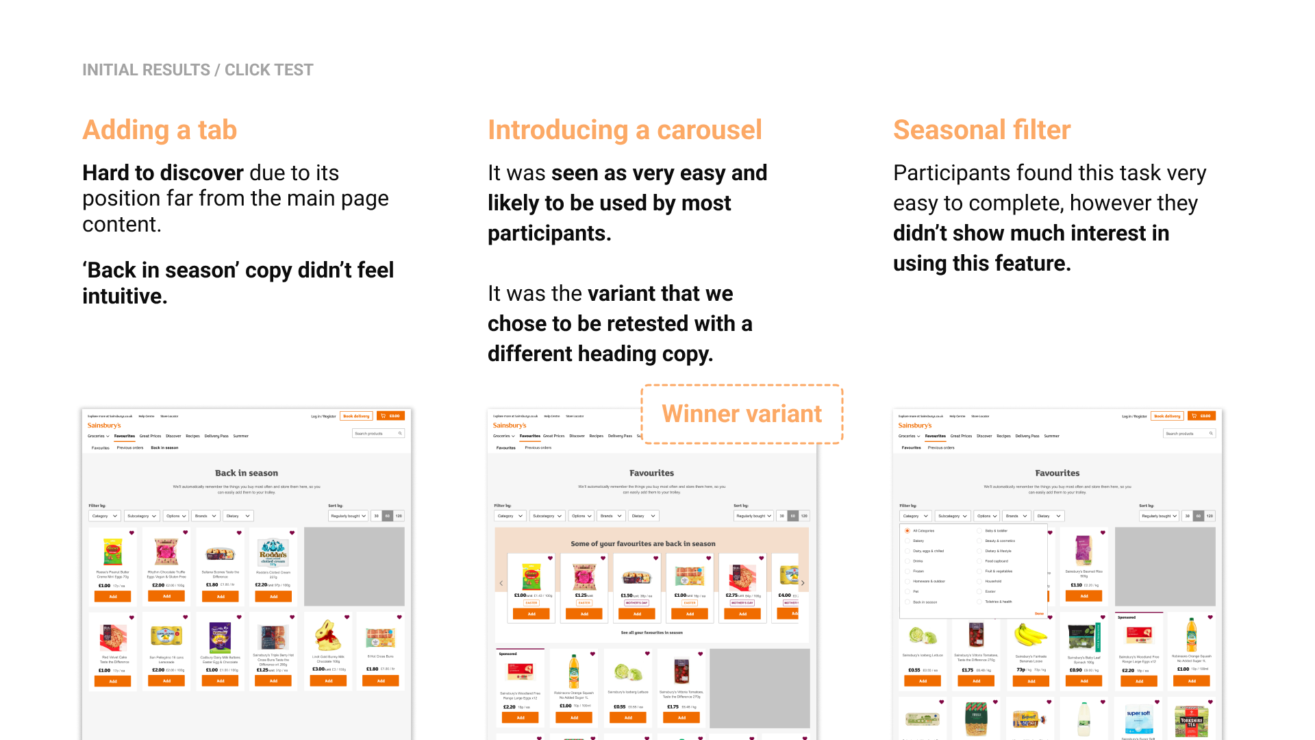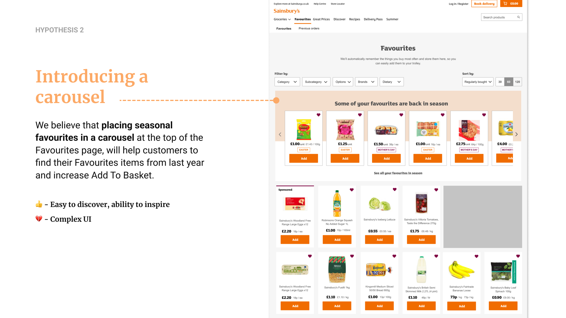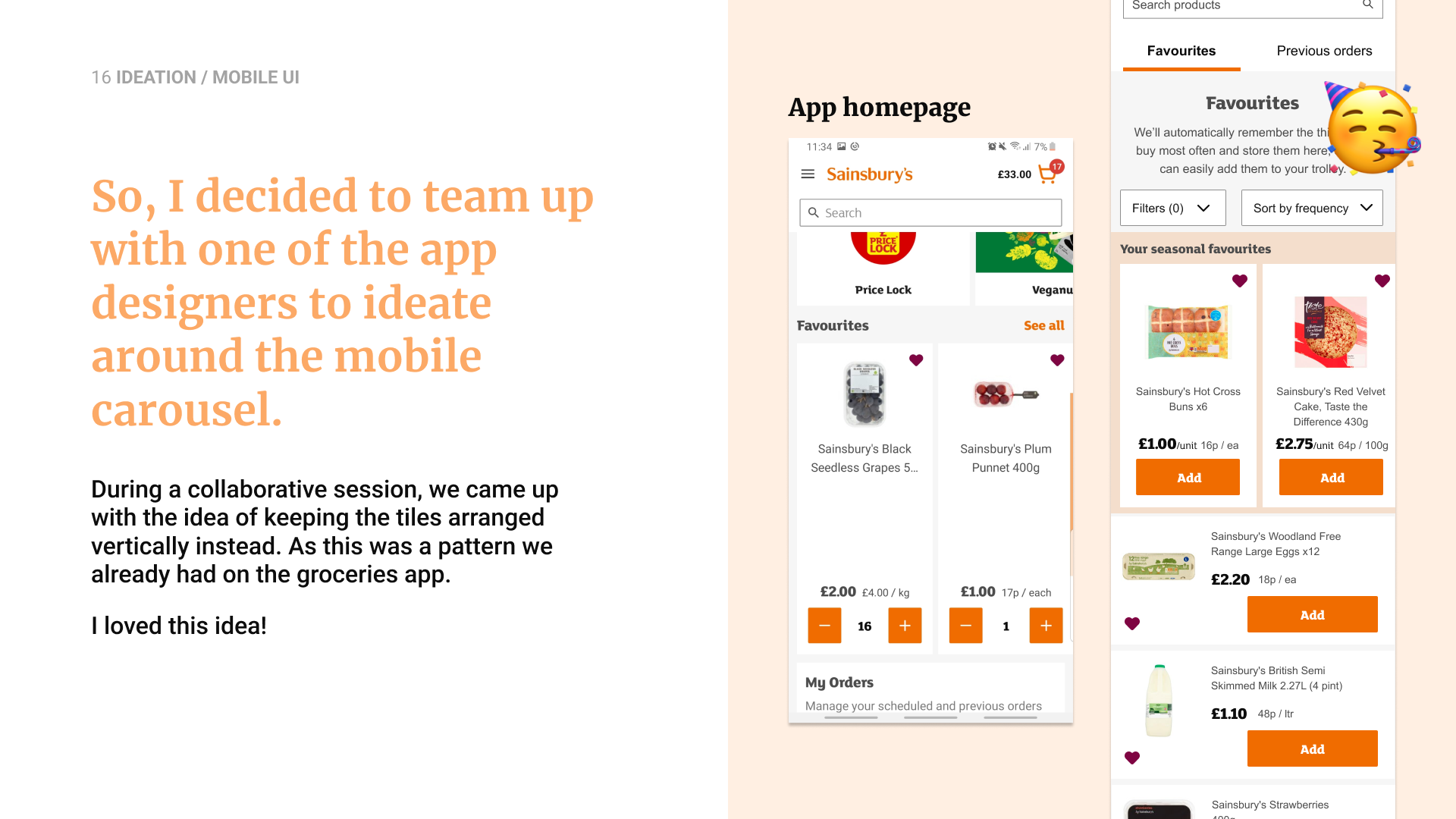 I designed and launched the Seasonal Favourites carousel, used in 35% of customer sessions in its first quarter and increasing seasonal participation from 5% to 25%.